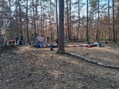 Die Klassen 1a und 2e fahren regelmäßig in den Wald. Dort lernen wir viel über die Natur, machen aber auch Deutsch- und Matheunterricht. Die frische Luft und die viele Bewegung helfen uns beim Lernen. Laufdiktate machen uns dort besonders viel Spaß.